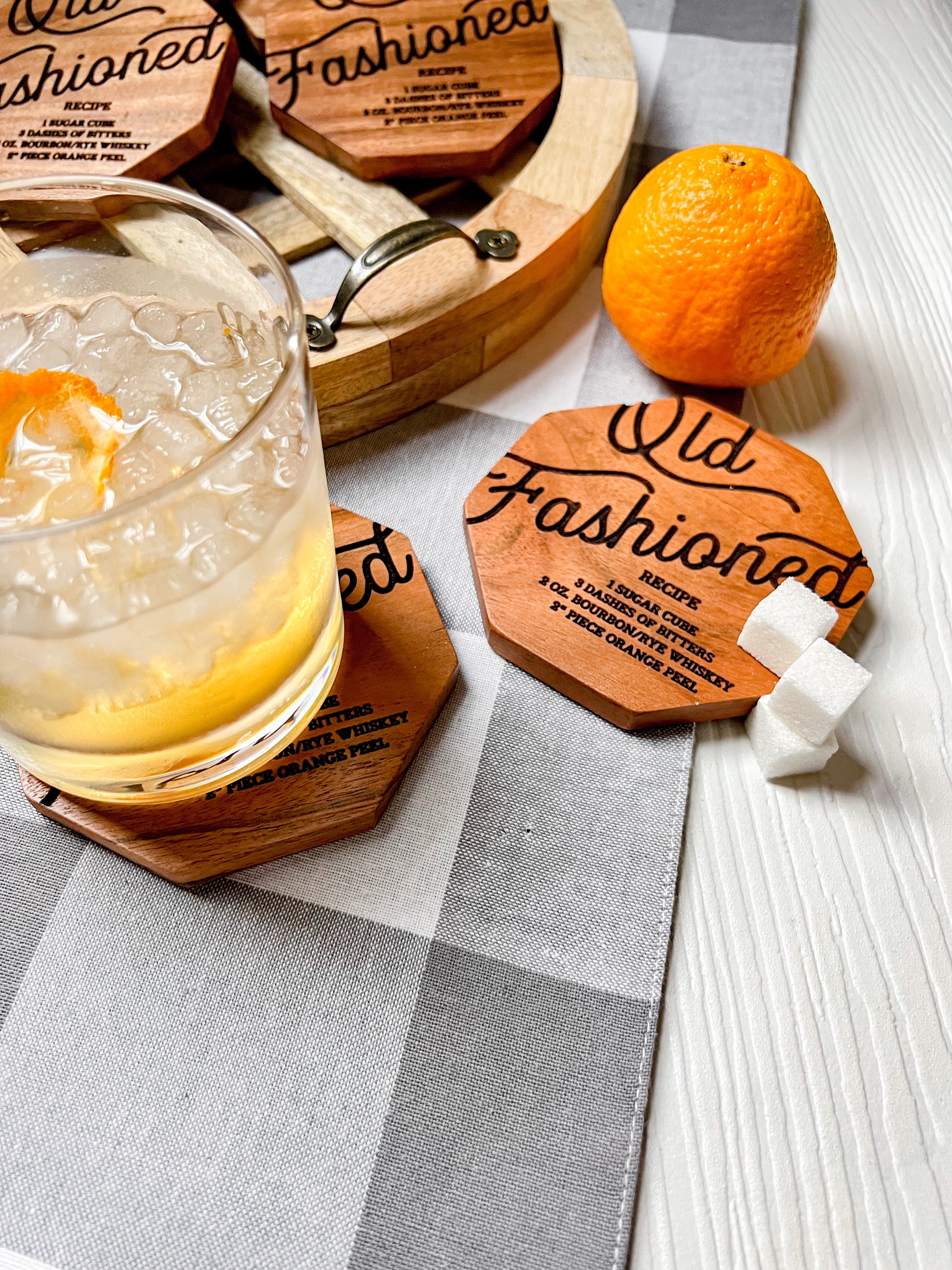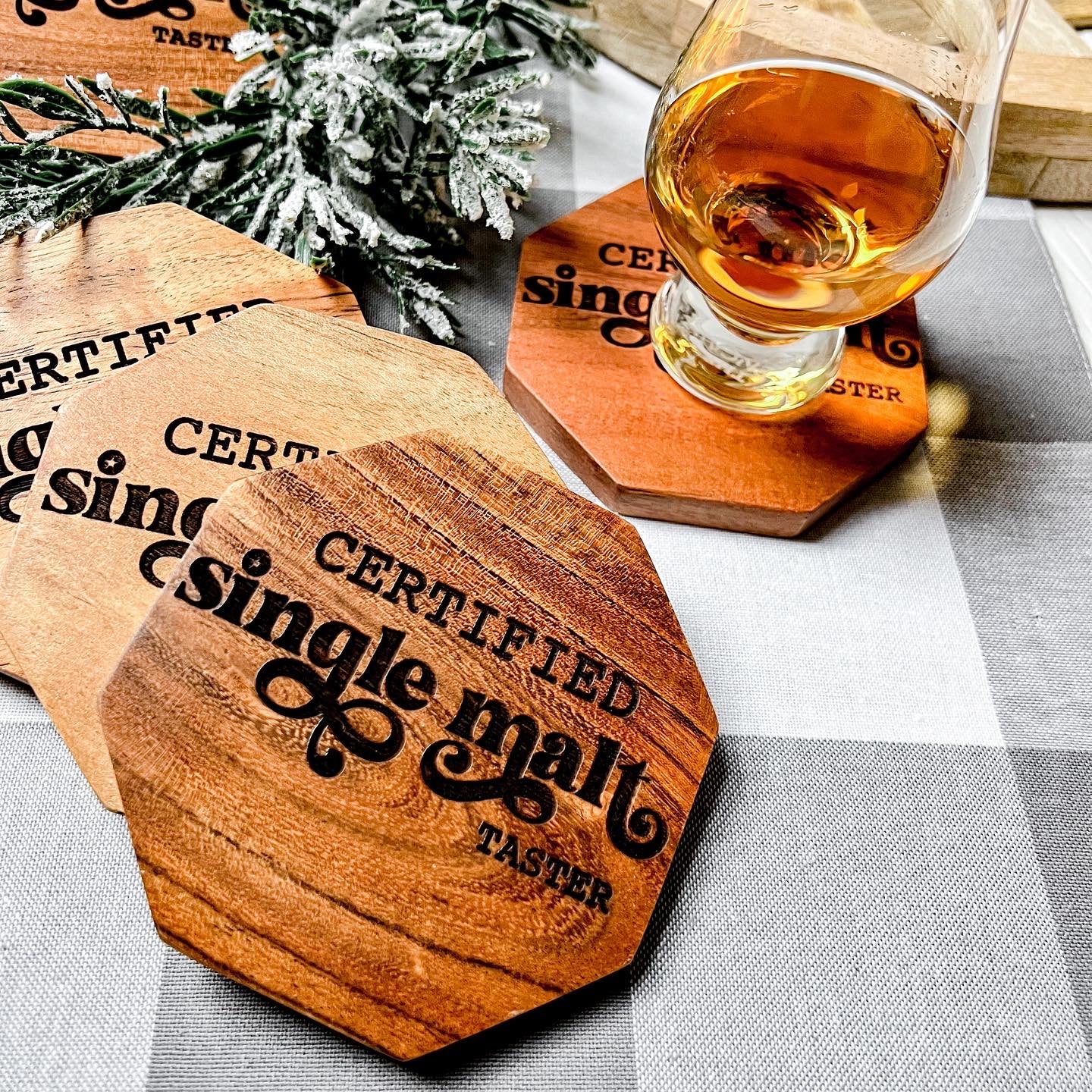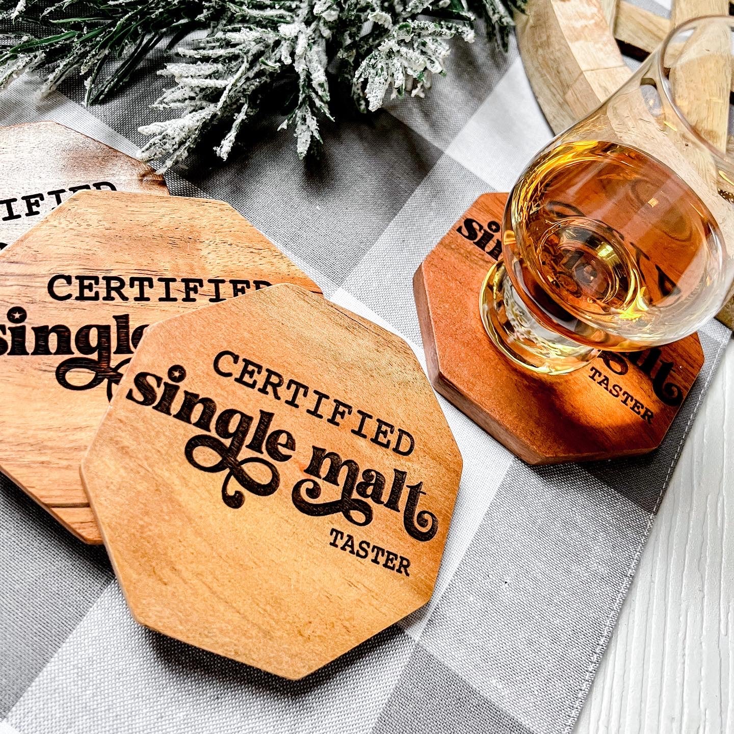Elevate your barware to a whole new level with these Wooden Coasters. Featuring sophisticated typography and classic styles, these certified bourbon and single malt tasters, along with the old fashioned recipe coasters, are made with luxurious acacia wood and are professionally laser engraved. An elegant addition to any bar.