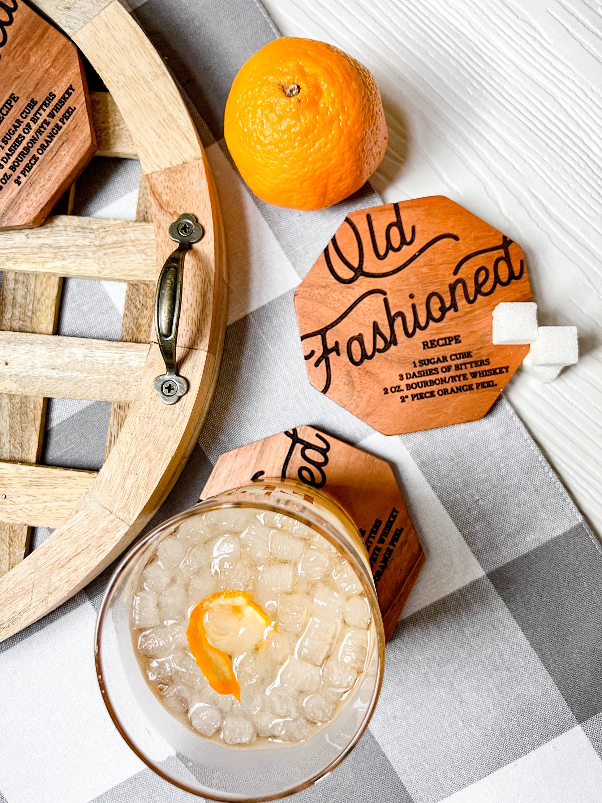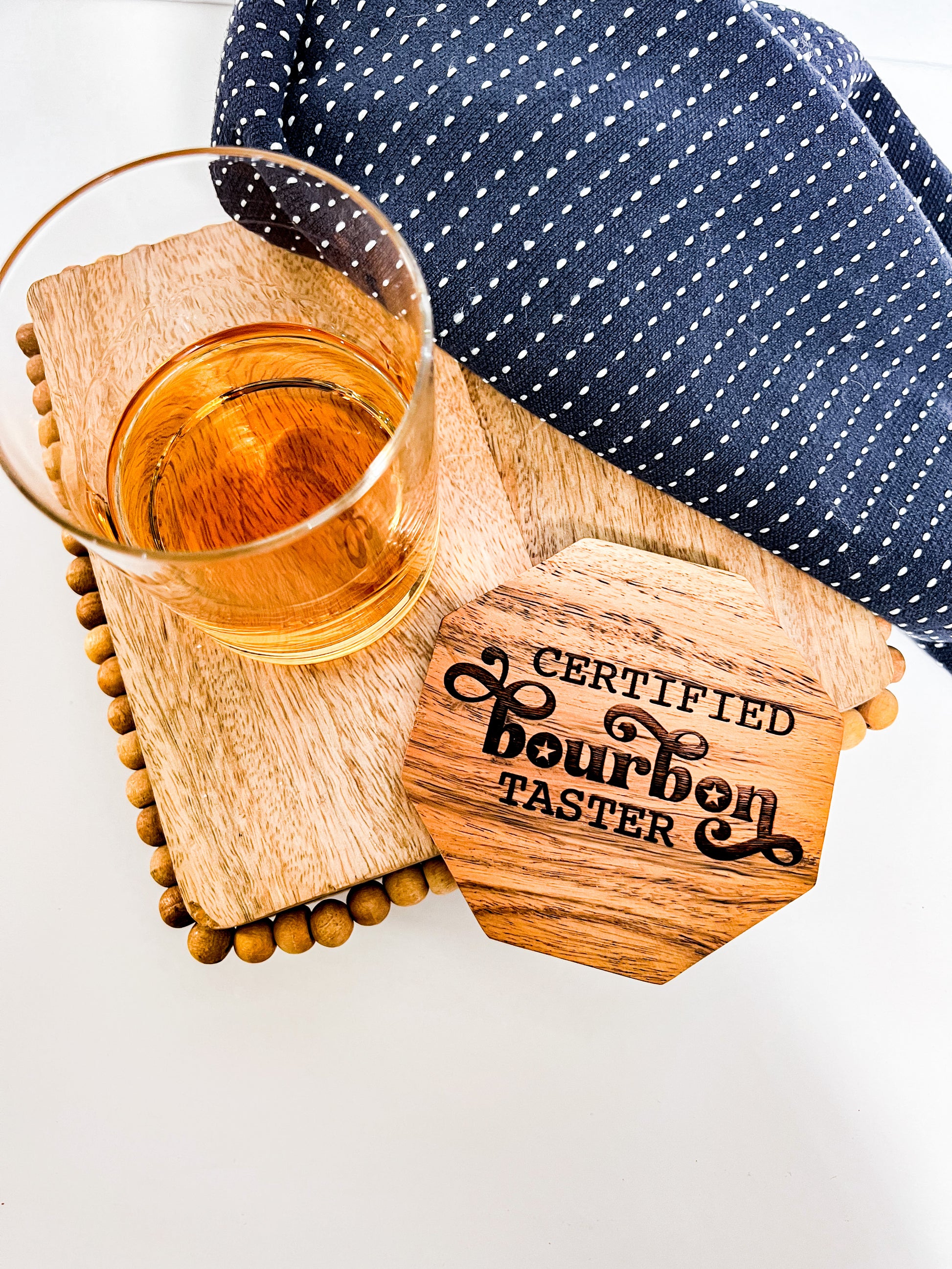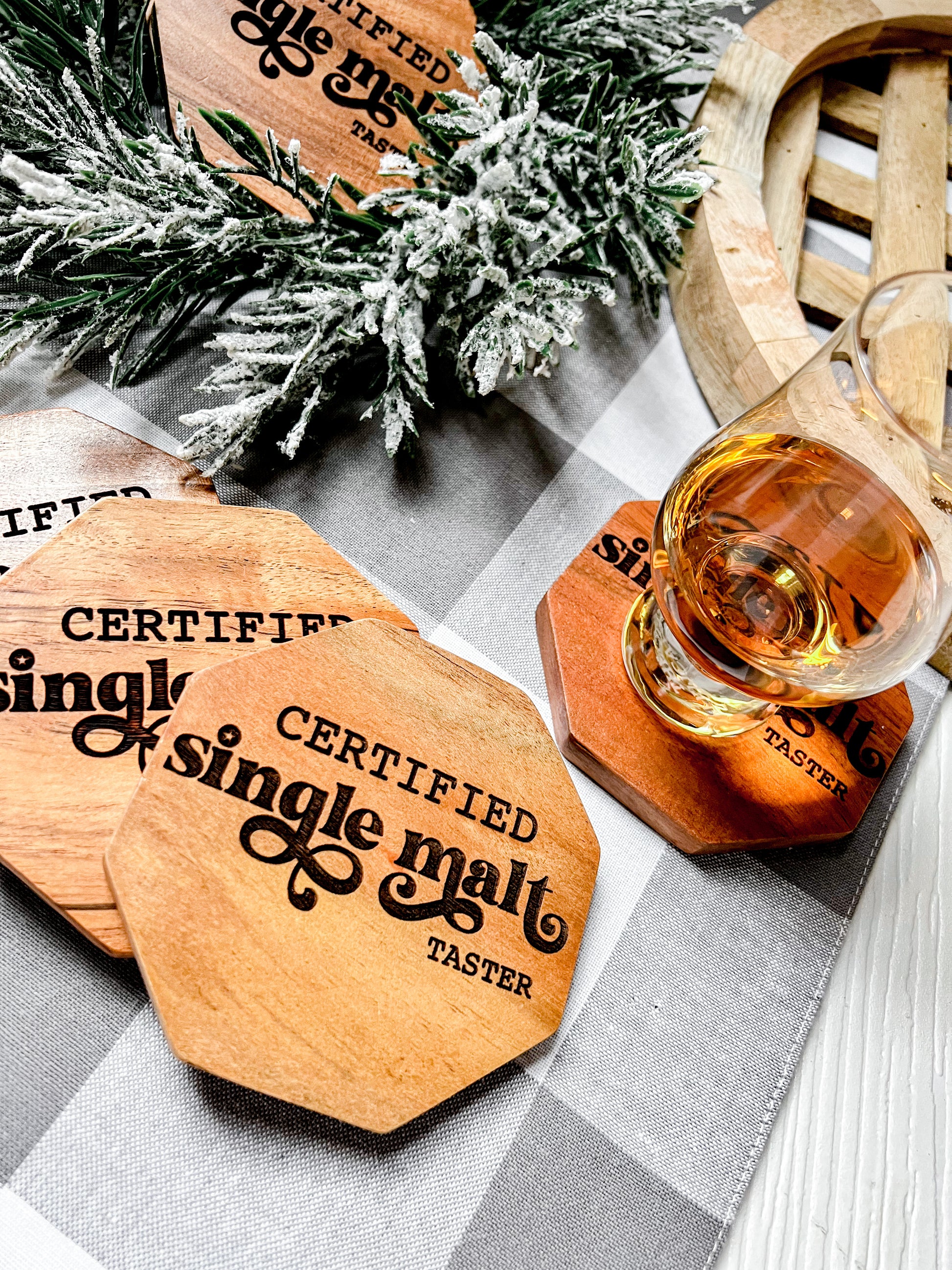 Elevate your barware to a whole new level with these Wooden Coasters. Featuring sophisticated typography and classic styles, these certified bourbon and single malt tasters, along with the old fashioned recipe coasters, are made with luxurious acacia wood and are professionally laser engraved. An elegant addition to any bar.