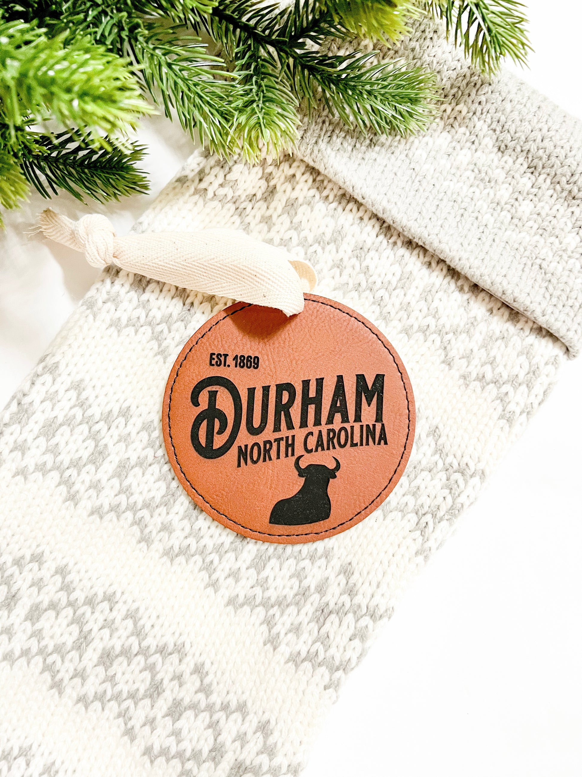 Custom designed hometown leather ornament. the design is engraved directly into the leather. Approximately 3.75” in diameter. It is lightweight, can be used as a gift tag, ornament or promotional gift. looking for a specific hometown. Please send a message to inquire.