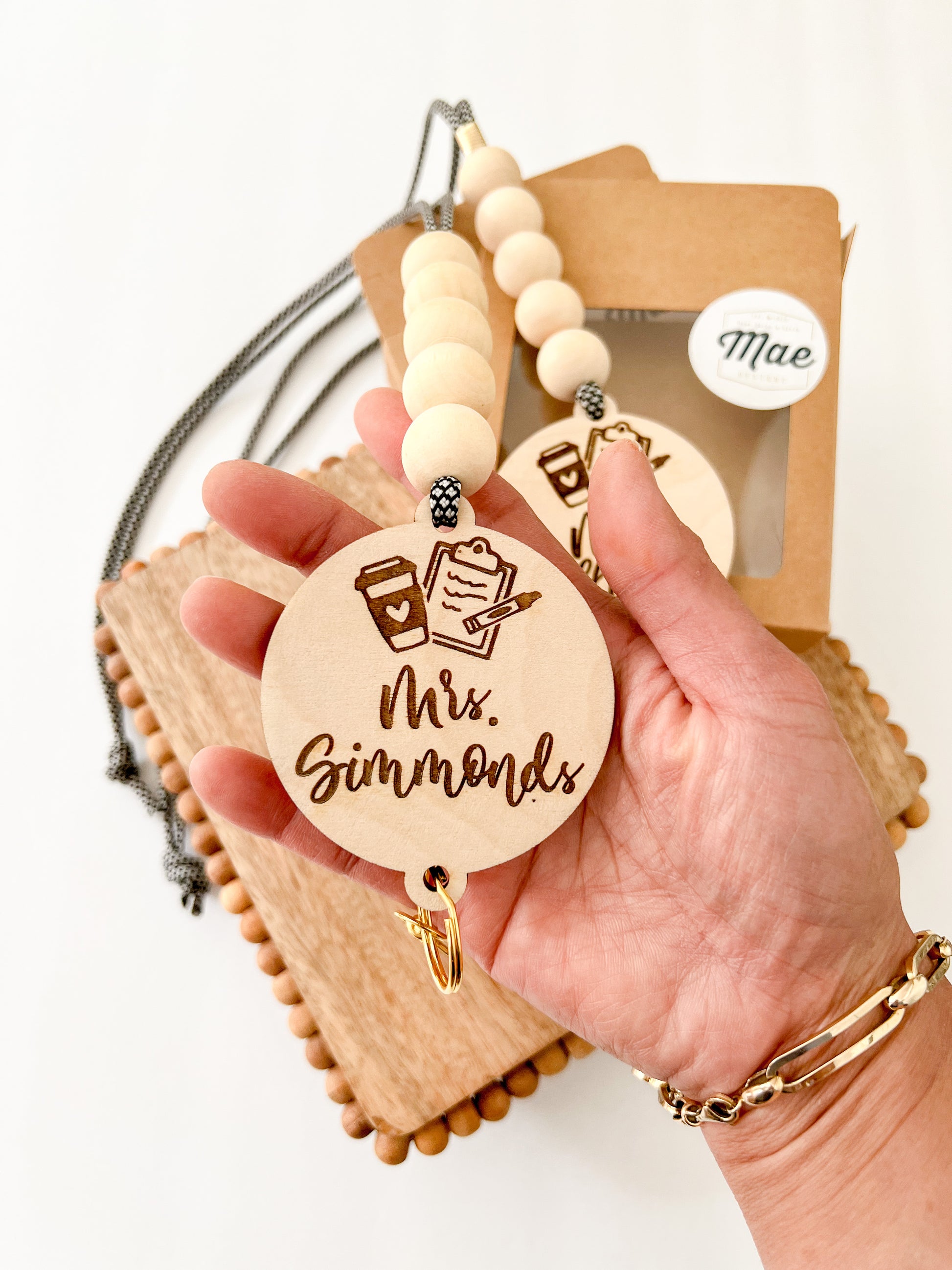 A custom engraved lanyard is perfect to hold your teacher badge and classroom key! There is a wooden circle for your name and a keychain clasp to hold your badge and keys. Made with leather cording, wood, and natural beads. Perfect gift for a teacher!