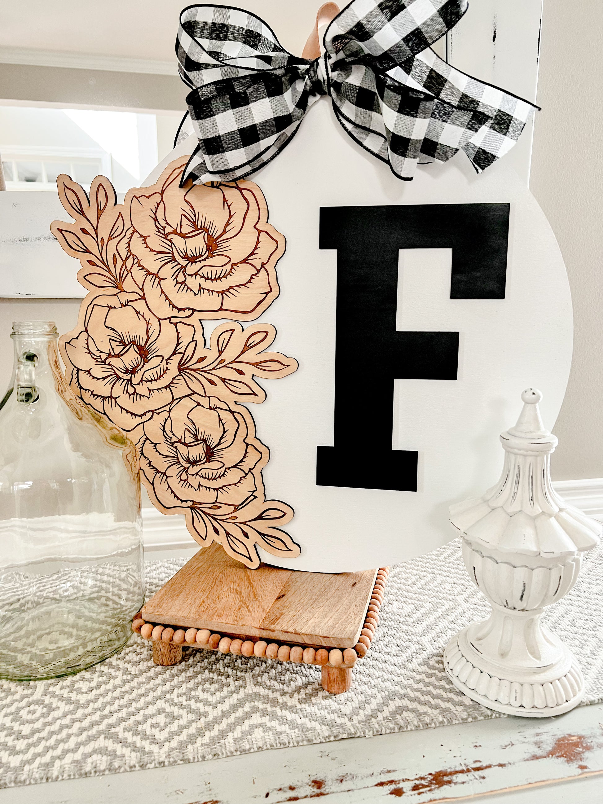 This custom round wood sign with your initial! Each sign is cut, sanded, and stained/painted just for you. These signs are unique, one-of-a-kind pieces that are completely personalized to fit your style.