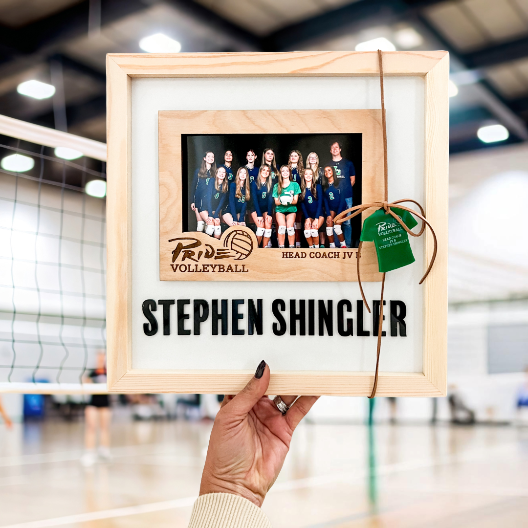 Custom team sports plaque approximately 12”x12”. Featuring a full color photo print of your team. Designed with your team name, coach and logo. Teams can sign the framed gift during the last day of your practice or game.